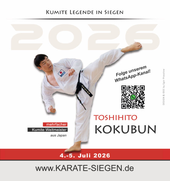 Veranstalltungen & Termine T E R M I N E | dojo 27.02.2026 – Jahreshauptversammlung / Jungendversammlung T E R M I N E | lehrgänge 7.-8. Februar 2026 - JKA Lehrgang mit Daisuke Ueda 4.-5. Juli 2026 - Kumite Legende in Siegen - Toshihito Kokubun 26.-27. September 2026 - Samurai Spirit Seminar mit Malcolm Dorfman und Thomas Schulze