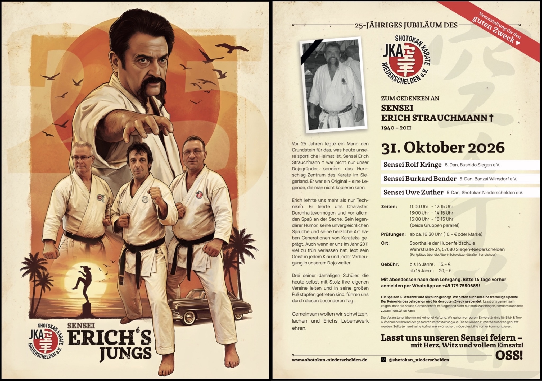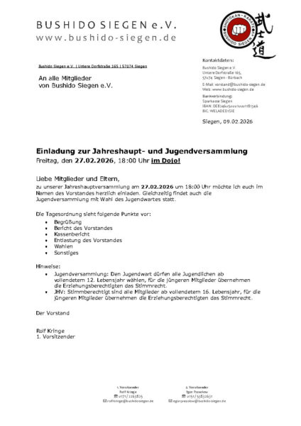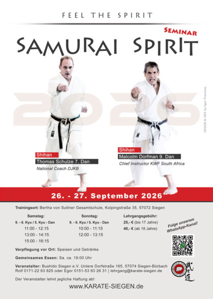 Veranstalltungen & Termine T E R M I N E | dojo 27. Februar 2026 - Jahreshaupt- und Jugendversammlung T E R M I N E | lehrgänge 7.-8. Februar 2026 - JKA Lehrgang mit Daisuke Ueda 4.-5. Juli 2026 - Kumite Legende in Siegen - Toshihito Kokubun 26.-27. September 2026 - Samurai Spirit Seminar mit Malcolm Dorfman und Thomas Schulze 31. Oktober 2026 - 25.Jähriges Jubiläum Shotokan Niederschelden