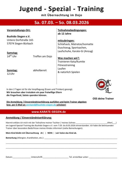Veranstalltungen & Termine T E R M I N E | dojo 27. Februar 2026 - Jahreshaupt- und Jugendversammlung 7.-8. März 2026 - Trainingswochenende für Jugendliche ab 12 Jahre 18. April 2026 Karate Trainingstag für Kinder und Jugendliche T E R M I N E | lehrgänge 7.-8. Februar 2026 - JKA Lehrgang mit Daisuke Ueda 4.-5. Juli 2026 - Kumite Legende in Siegen - Toshihito Kokubun 26.-27. September 2026 - Samurai Spirit Seminar mit Malcolm Dorfman und Thomas Schulze 31. Oktober 2026 - 25. Jähriges Jubiläum Shotokan Niederschelden